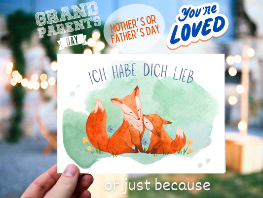 German greeting card for any occasion with big and small fox "Ich Habe Dich Lieb"