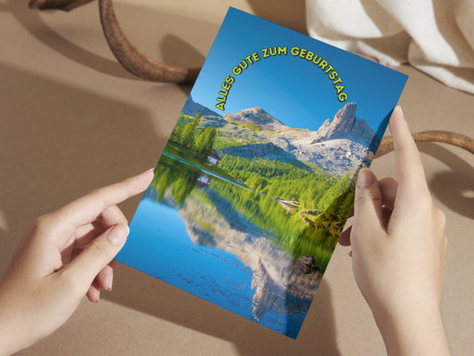German Birthday card with Alpine mountain scene "Alles Gute zum Geburtstag"