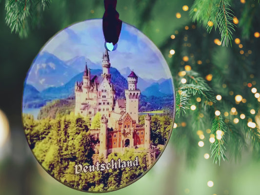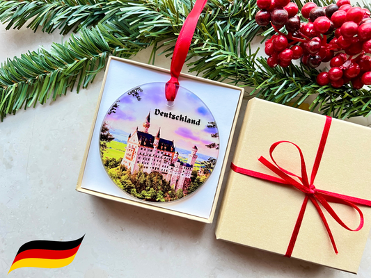 Deutschland German castle glass ornament with gift box - Neuschwanstein with blue mountains