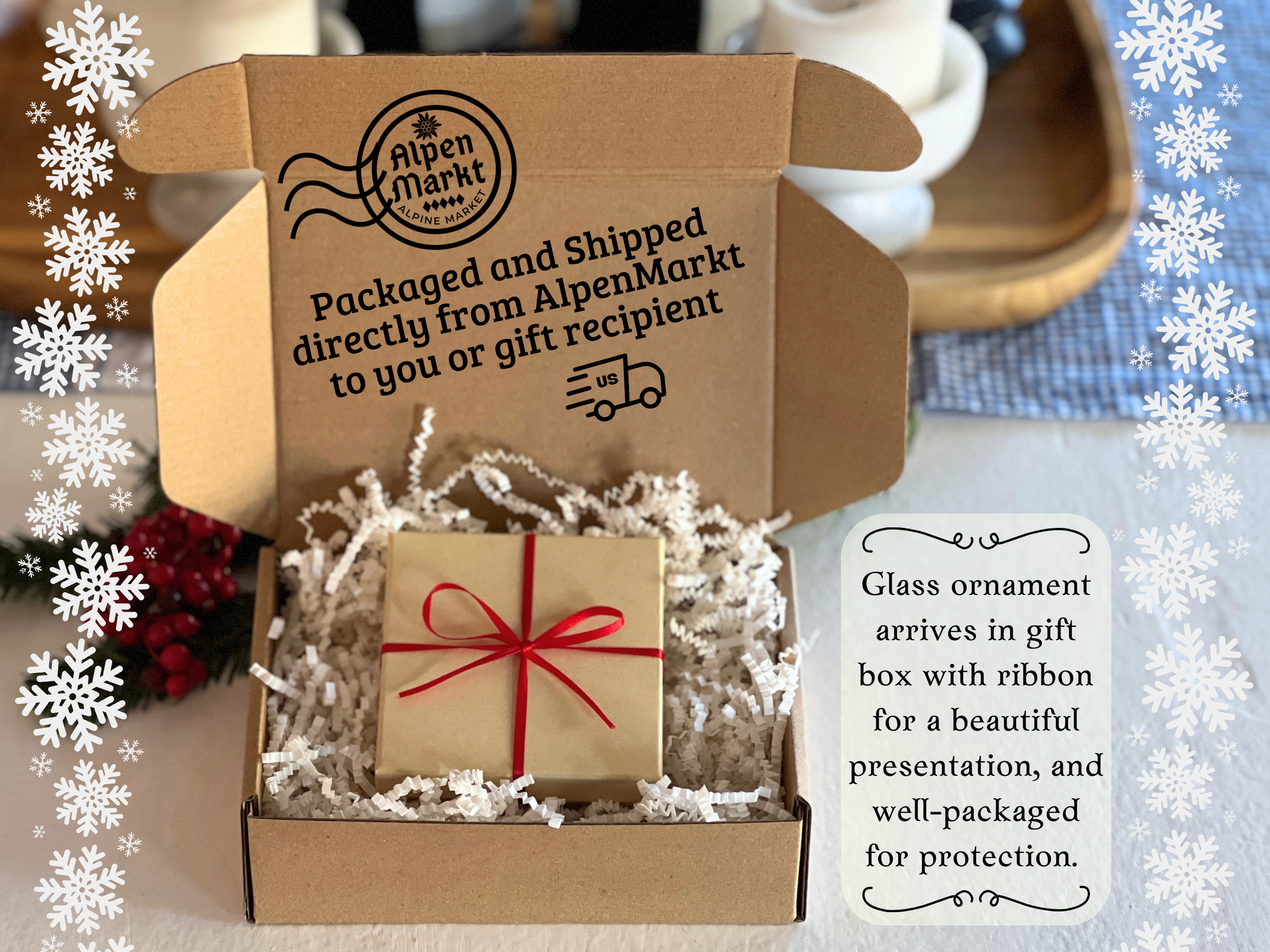 Solid glass ornament is 3” round with attached red ribbon so it’s ready to hang on the tree or anywhere. Glass artwork looks great all year round. Includes a gift box tied with a ribbon for protection and presentation. We ship quickly from the US in a well-padded durable box to ensure safe arrival.