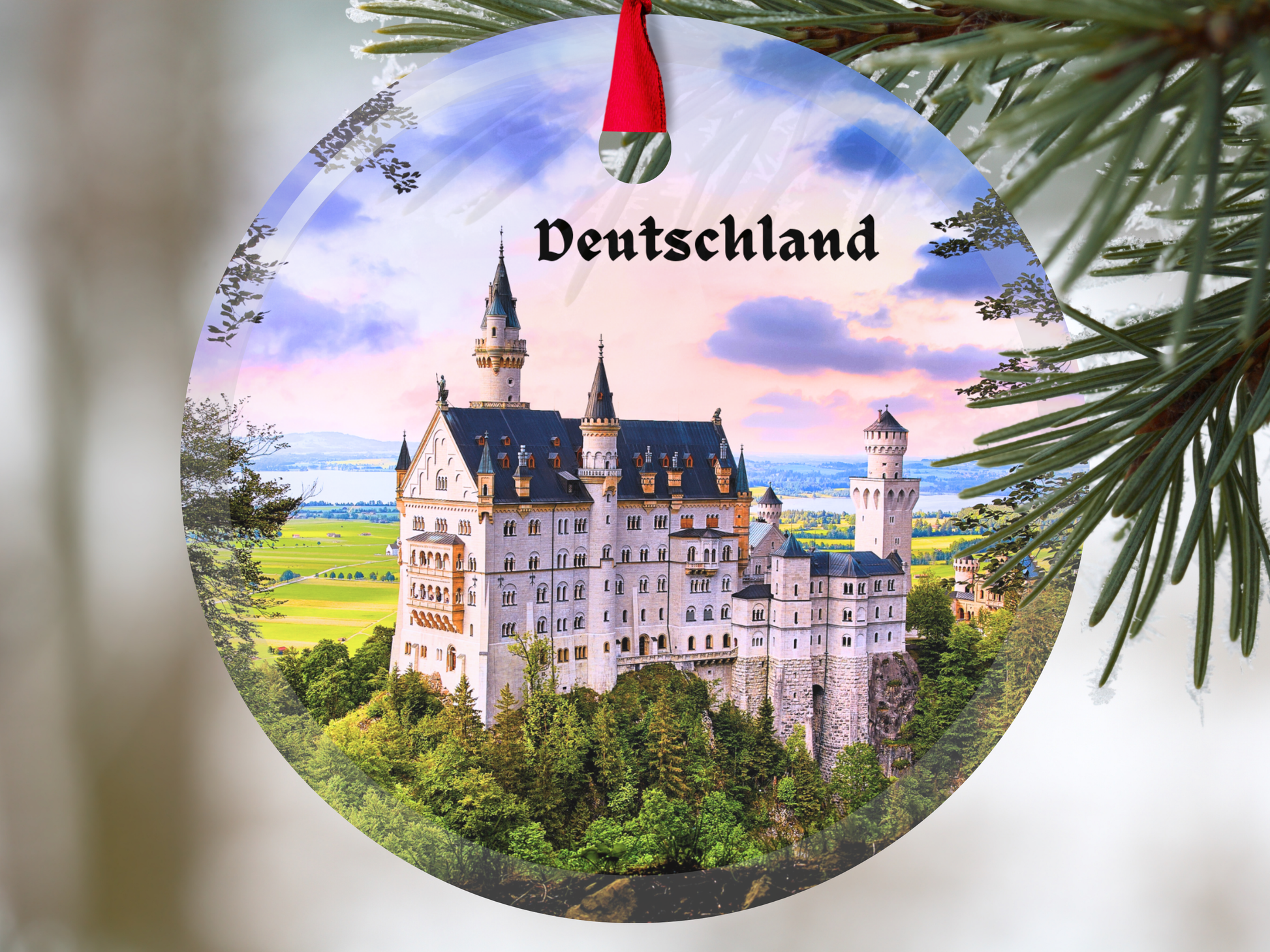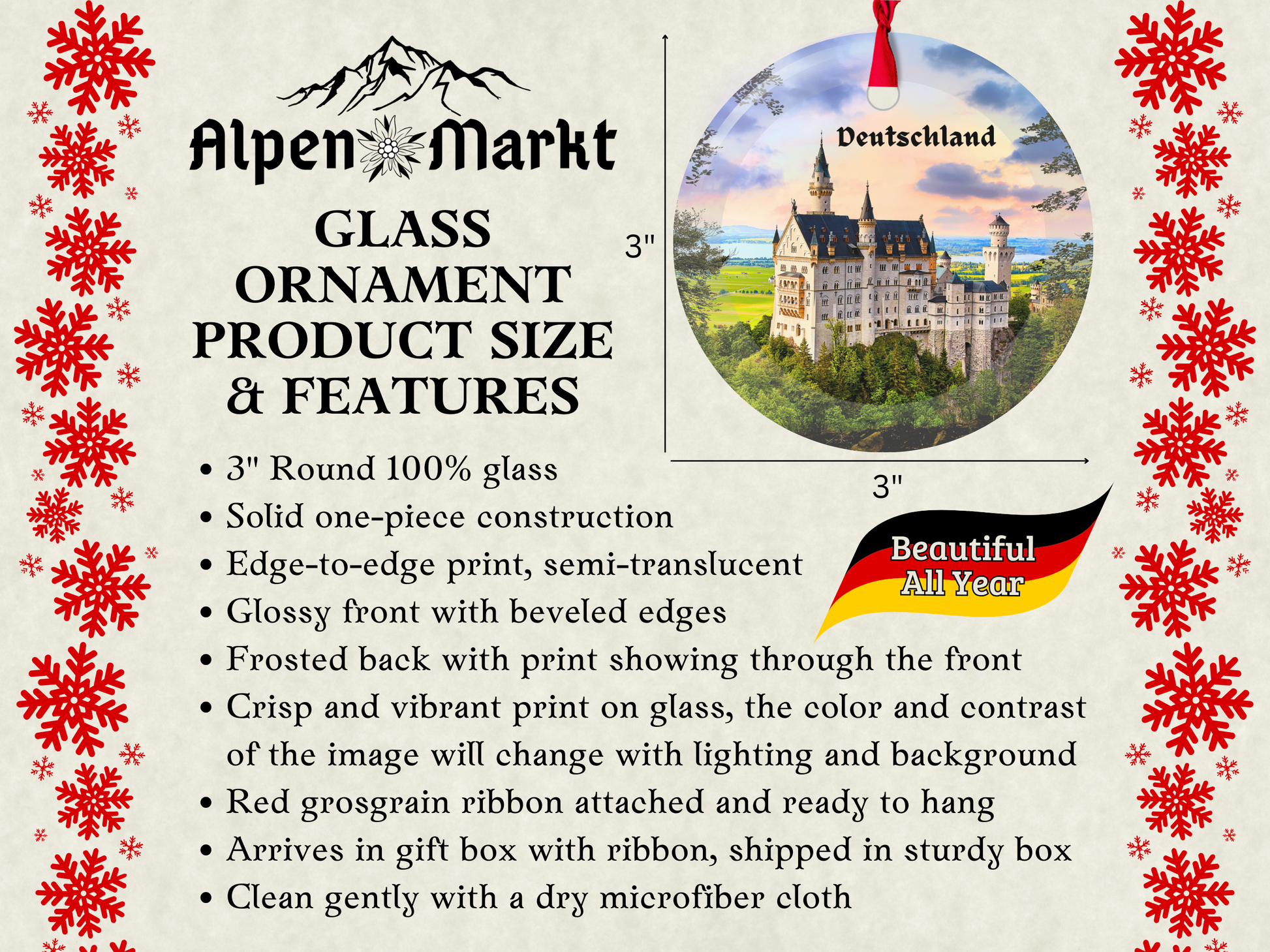 Exquisite glass ornament features the fairytale castle Neuschwanstein in the German Alps. This makes a lovely addition to your holiday décor and looks great year-round. Also makes a meaningful gift any time of year for Deutsch family or friends, anyone who has visited Germany or was stationed there in the military, is of German ancestry, or simply loves to travel.
