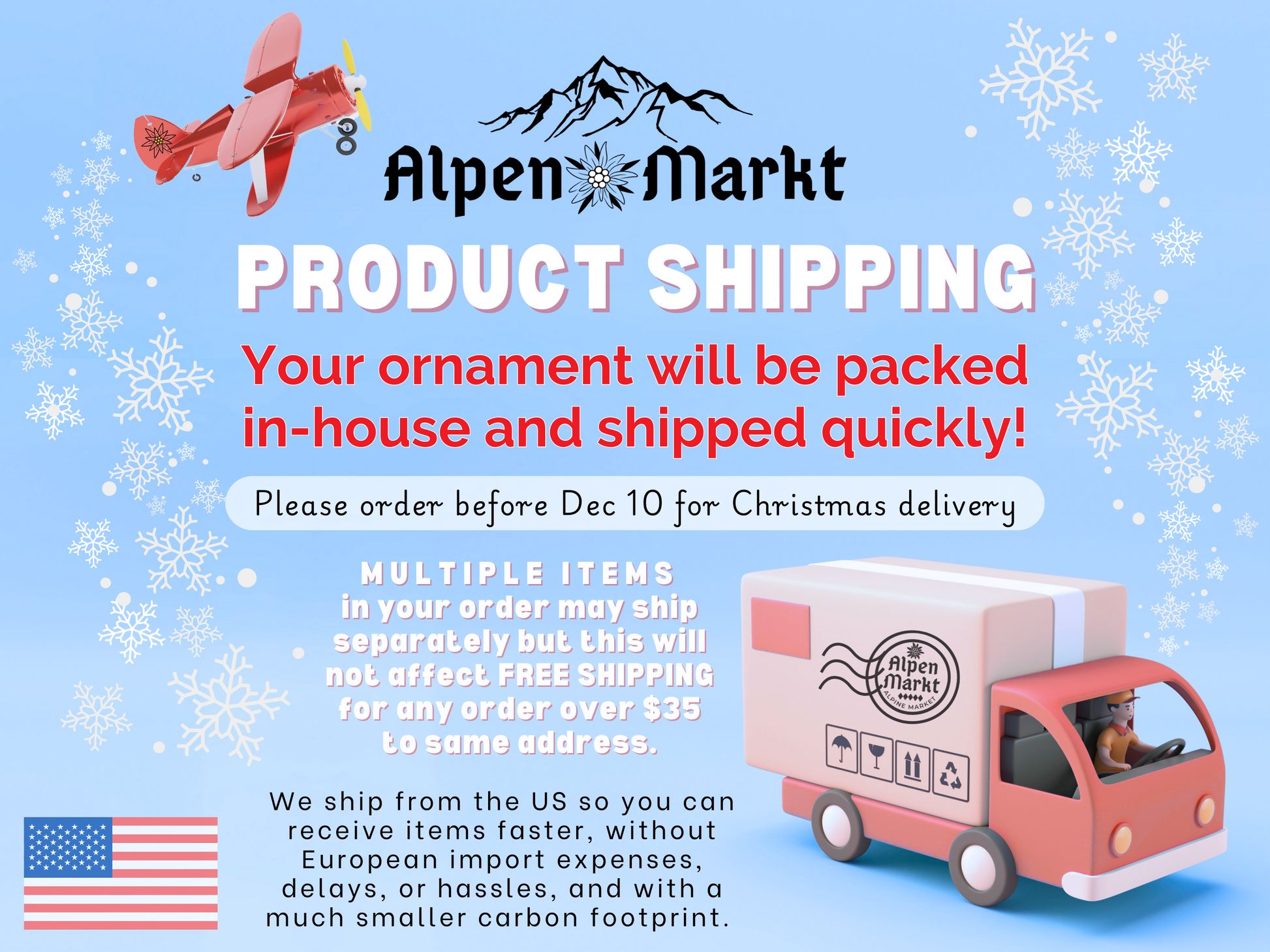 Orders from AlpenMarkt are processed and shipped within 3 business days. Please allow an additional 2-8 business days for carrier shipping. Orders from AlpenMarkt Print Partners will be processed and shipped separately. Please check the item description for more information.