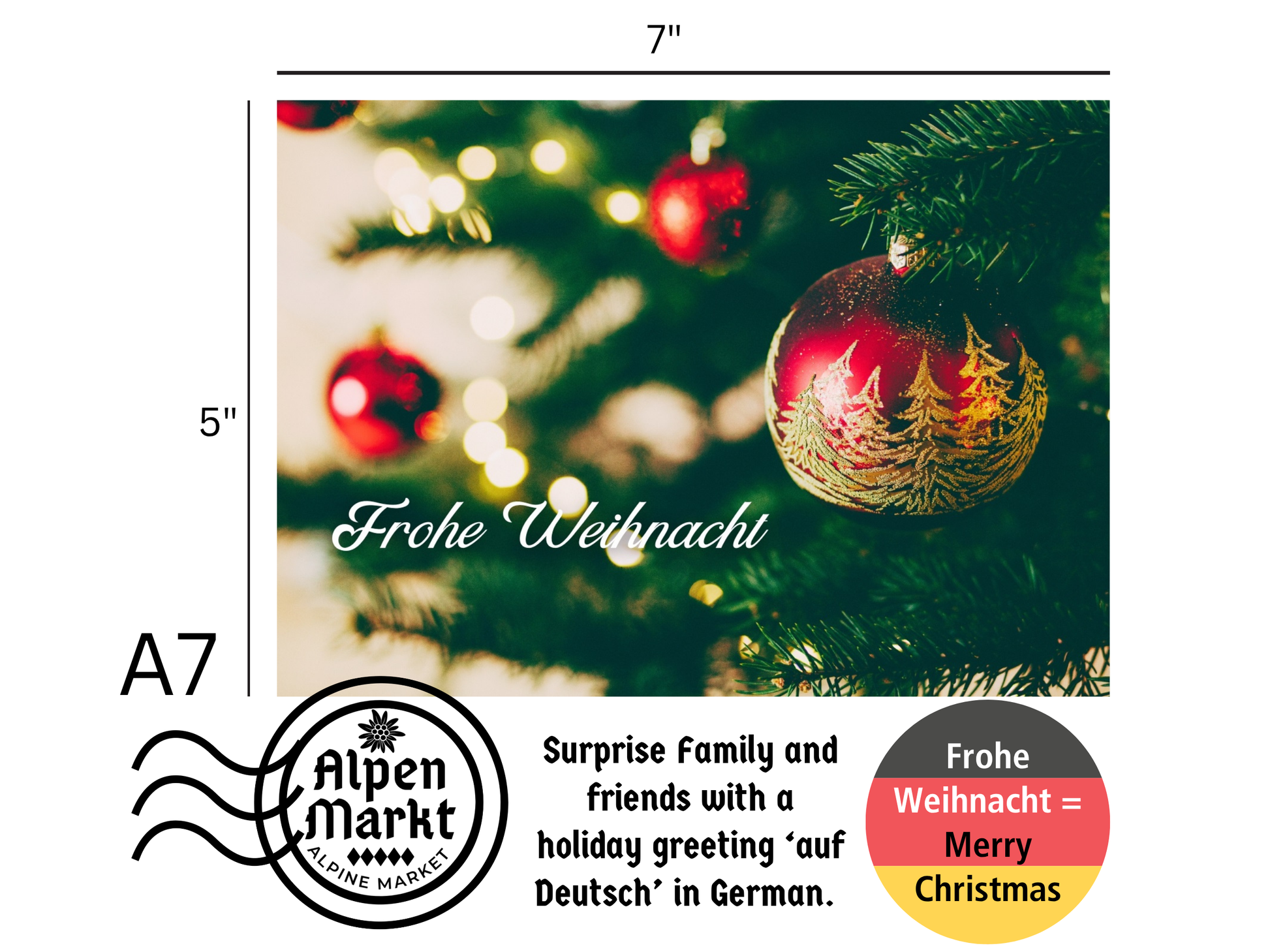 Greeting card features a classic Christmas ornament hanging on a tree and "Frohe Weihnacht" which means Merry Christmas. Surprise Oma, Opa, Mama, Papa, family, friends, and neighbors with a Christmas card ‘auf Deutsch’ - in German.