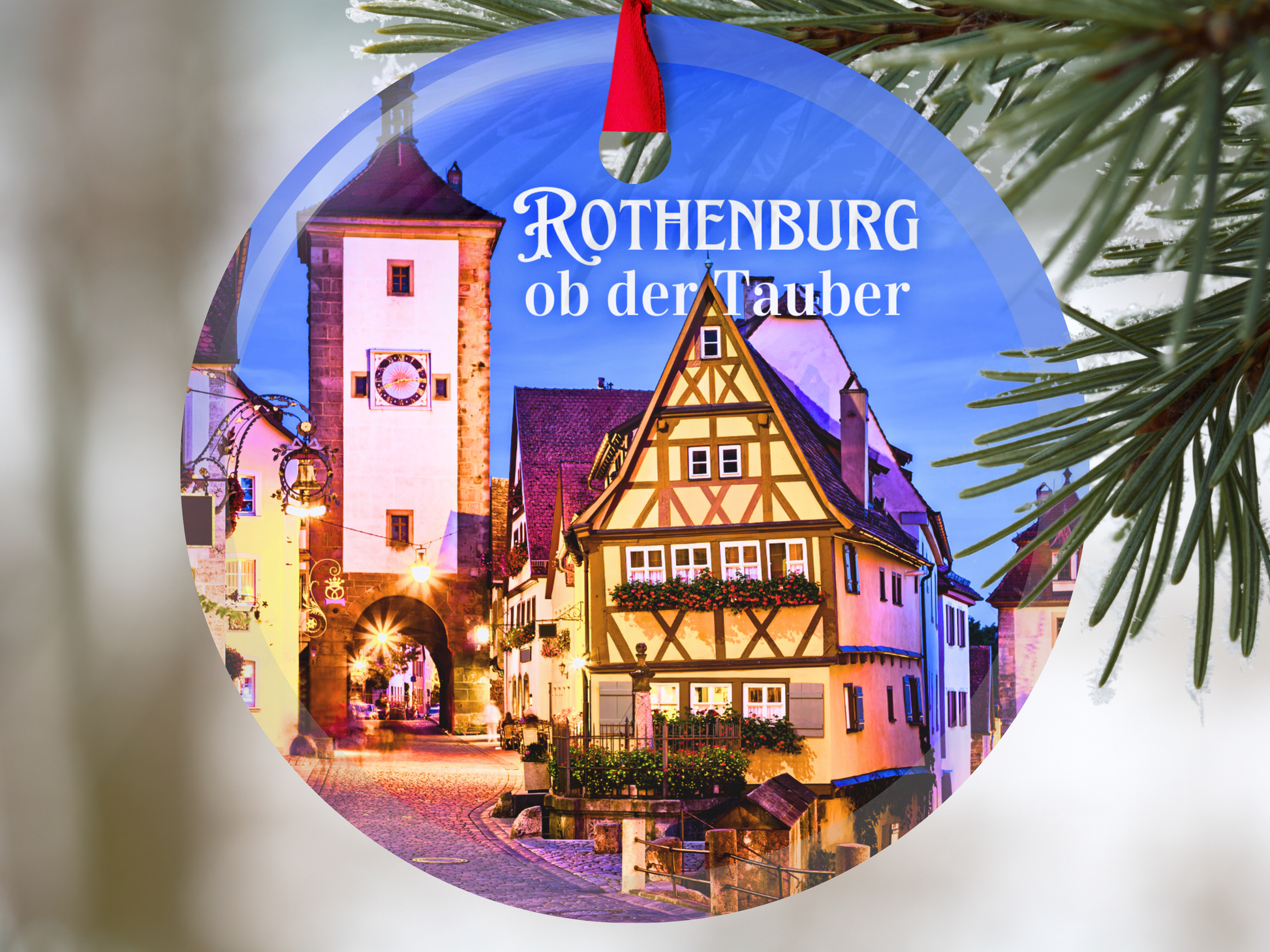 Exquisite glass ornament features the beautiful village of Rothenburg ob der Tauber, Deutschland (Germany), a medieval walled town in the Franconian region of Bavaria. This makes a lovely addition to your holiday décor and looks great year-round. Also makes a meaningful gift any time of year for Deutsch family or friends, anyone who has visited Germany or was stationed there in the military, is of German ancestry, or simply loves to travel.